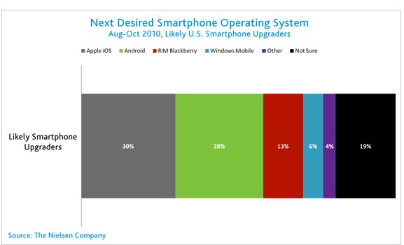 Google’s Android OS continues to grow in popularity, possibly at the expense of Apple’s iOS and RIM’s BlackBerry, according to Nielsen data released today. The company reports that in an October survey, Apple’s iOS and Android were tied for “most desired” operating system” when mobile users who planned to upgrade to a smartphone in the next year were asked about their next phone.