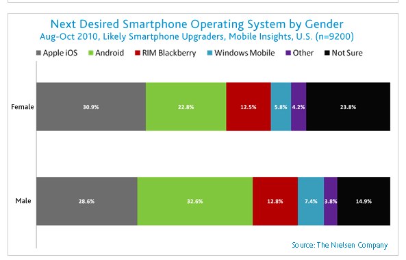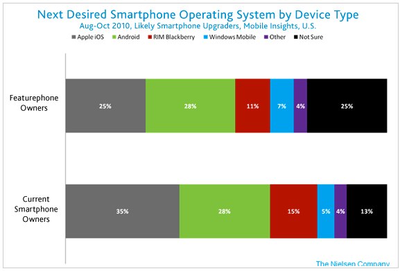 Featurephone owners planning to get a smartphone are less likely to have made up their mind about the OS they will choose: 25 percent were “not sure” what their next desired OS might be compared to 13 percent of smartphone owners. This “undecided” group could be a pretty influential market for smartphone OS companies who are looking to sway consumers.