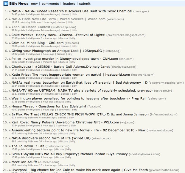 Bitly News is modeled on Hacker News, the headline news site for developers. The site only shows headlines and where they come from in rank order. Each headline links directly to the original story. Under each headline you can see how many times it’s been clicked on and when it was posted. You can comment on Bitly News or click through to bit.ly to see more stats for that headline.
