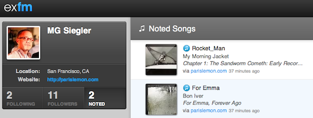 With the new version, you can also “note” songs. Essentially, this is a “favorite” or “like” mechanism. It allows you to tag songs to your exfm profile that anyone can then visit and see what you’re recommending. These profile pages are a new feature in the latest version of the service as well, and they make it so you can follow other users with musical tastes you enjoy. And yes, there’s an activity stream on the main page of exfm.