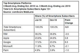 Similar to the data from last month, RIM took the top spot as the leading mobile smartphone platform in the U.S. with 35.8 percent share of U.S. smartphone subscribers, which is down 3.5 percent from the last period. Apple followed with 24.6 percent share (up 0.8 percentage points). Google’s Android OS saw the strongest growth, rising 6.5 percentage points to capture 23.5 percent of smartphone subscribers. Microsoft accounted for 9.7 percent of smartphone subscribers, while Palm accounts for 3.9 percent.