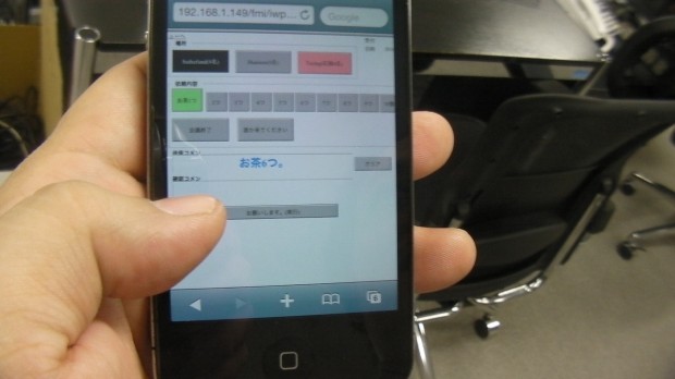 When Shimizu has guests in the conference room, he fires up an app on his iPhone, asking for drinks. In the picture below, you can see his request for 6 cups of tea: