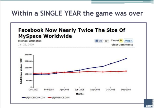 We all know Friendster was the trailblazer in this category allowing people to create personal pages and connect to other people in a LinkedIn style but without the “business” and with a little more interactivity (let’s face it, for the longest time most users “friended” people on LinkedIn but then never really did much else). But Friendster’s computer systems couldn’t keep up with the explosive growth (reportedly due to the complexity of the security model set up to control connections, privacy and authenticity of users) so MySpace was hot on the heels and swept up the market in a very rapid ascent. Friendster was DOA.