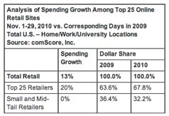 comScore says that larger retailers are doing particularly well this season, with the growth in spending for the holiday season remaining primarily from the top 25 online retailers. These e-retailers have seen seen their total dollar sales grow 20 percent while small and mid-sized retailers’ sales have been flat. The top 25 retailers have gained 4.2 points of market share to a level of 67.8 percent since the 2009 holiday season.