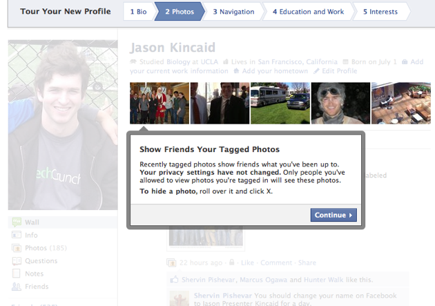 The second interesting thing about the rollout is the new ‘wizard’ that users will see immediately after activating their new profiles. Using some nifty popup and fade effects, Facebook will walk you through a handful of steps highlighting the major changes to profile — the new photo stream, menu layout, and so on. The process only takes a minute or two to complete, but it’s definitely a big improvement over some of Facebook’s past rollouts.