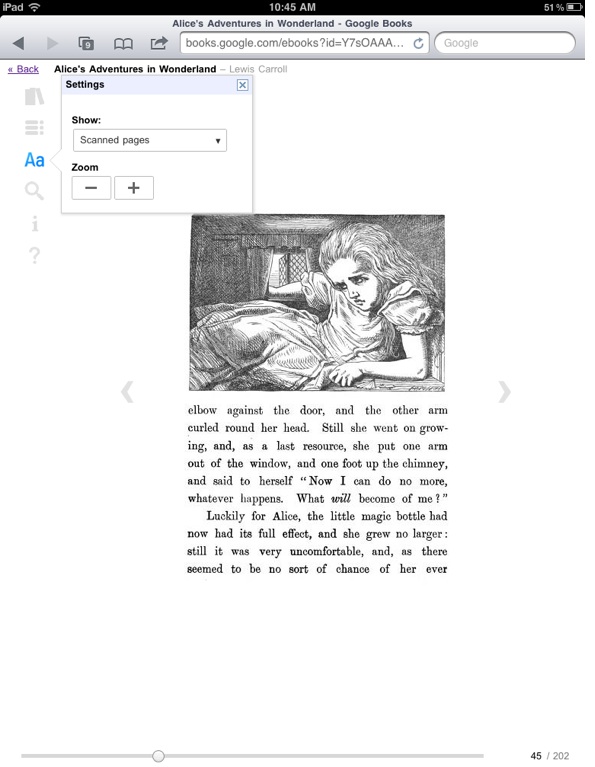 The HTML reader is basic but functional. On an iPad, you can read one page at a time vertically, or two pages horizontally. It lets you choose different fonts, and even read the original scanned version of the book (see screenshots below comparing the scanned version to the “flowing text” version). Google eBooks also maintains the orignal pagination as best it can, which is much better than the random-seeming “location” numbers you find on a Kindle. But there are no page-turning animations like you get in Apple’s iBooks app. That may sound like a trivial nitpick, but that swiping animation is one of those details which make digital books a pleasure to read in iBooks (my children fight over who is going to turn the next page when I read them the Winnie-the-Pooh book that comes with the Apple digital reading app). Unlike the browser version, the Google eBooks iPad app does include page-turning animations.