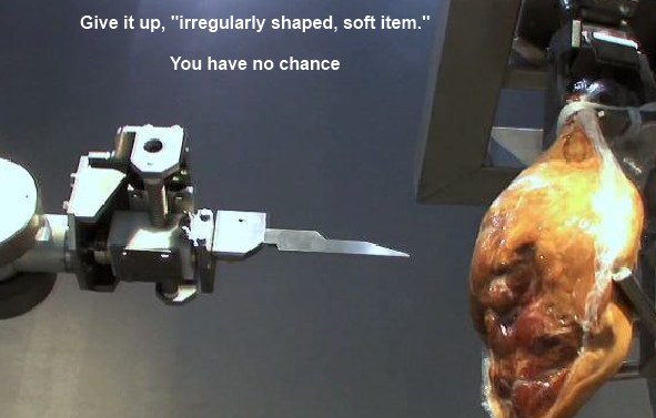 This robot follows in the footsteps of its brethren peopling (if that’s the right word) factories and assembly lines. It’s a precision device with a sharp, sharp knife on the end, and its job is to take a big chunk of ham and separate the meat from the bone. It’s a good thing they’re fixed to the ground. A free-roaming flesh-stripping bot would be just a little too much.