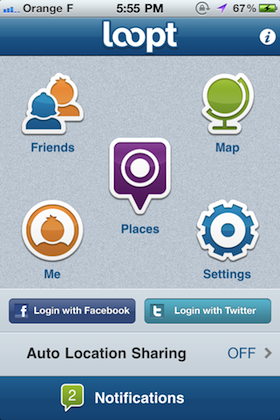 The first thing you’ll notice about Loopt 4.0 is that it has been entirely redesigned. More importantly, the app has been significantly simplified, to clean up the user experience. On the main screen you can now quickly jump to five areas: Me, Settings, Places, Friends, and Map. The last three are the most important because that’s where you will check-in and see where your friends are.