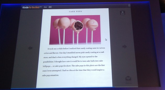 Amazon Windowshop. Looks a lot (identical?) to the iPad native app for Amazon Windowshop, that launched a few weeks ago. Have built a series of applications for all sorts of platform — Android to iOS. Today announcing Kindle for the Web (interesting that they’re doing this at a Google event, given that Google just launched its own competing ebook platform). Books laid out in a grid, there’s a Coverflow-like way to browse your books. Anyone can take these and add it to a website, “Make their website a bookstore for themselves”. Launching Kindle for the Web early next year.