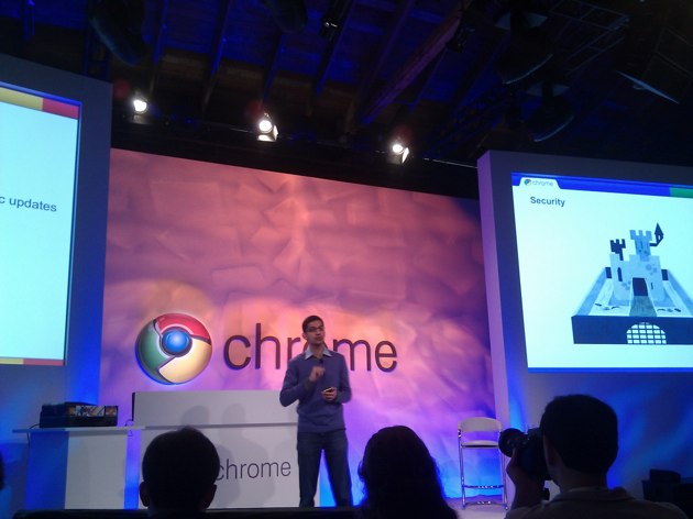 Gordon Payne SVP Citrix Systems on stage. Talking about Chrome OS in the workplace. Showing Citrix Receiver. Whether you’re int eh company or remote, can log in and get your applications. Shows Excel — clicking that and it opens it up. Looks native. “We’re accessing Excel in Chrome but it’s running on the server in the data center — the private cloud of the company. So it’s safe, secure, runs int he data center. It’s fast (faster than launching on a PC).” Expect to introduce this in first half of next year.