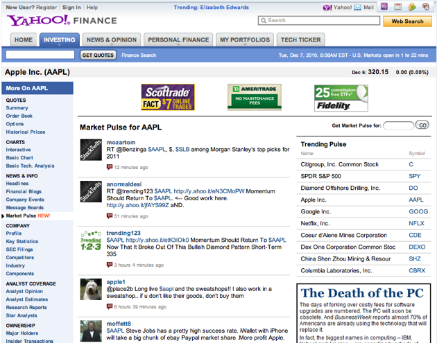 The stream is added under a new area Yahoo is calling Market Pulse, located in the left sidebar of any company page. Here’s the Market Pulse page for Apple, for example. Conversations are in the middle of the page and link back to StockTwits. On the right are trending stocks based on velocity of conversation.