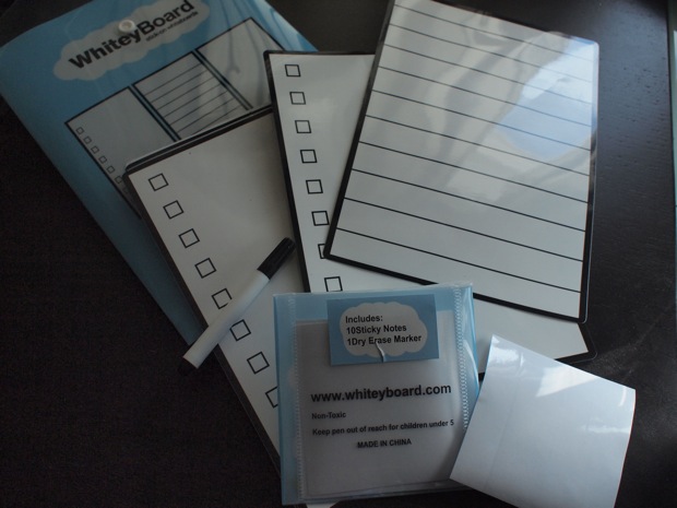 A few things really stand out as watershed moments in human history. The Polio vaccine and the moon landing are two, perhaps, and maybe there’s that whole Hadron collider thing. But when it comes to true breakthroughs I’d have to add one more to the list: the Whiteyboard. As you recall, Whiteyboards are big panels of dry-erase plastic that you can stick to any wall in the house or office. They are removable without damage to the underlying surface and they’re significantly cheaper than any other whiteboard solutions out there. The company just introduced WhiteyNotes, dry-erase sticky notes, and WhiteyPads, to-do list-type sheets for kitchens and/or kink dungeons.