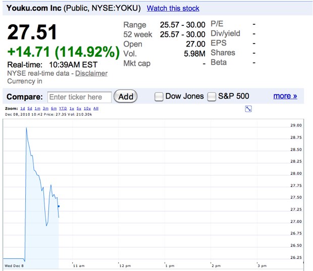 The Internet IPO is back—if you are a Chinese Internet company. Youku, the YouTube of China, saw its shares pop more than 100 percent in its IPO today. Shares were priced at $12.80, but they are currently trading at $27.60.. That is a 116 percent jump.