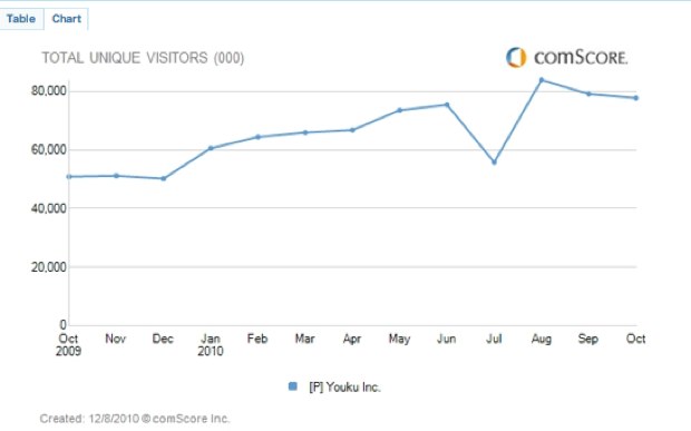 According to comscore, Youku attracted 77.8 million unique visitors worldwide in October, up 53 percent form the year before. Youku is a cross between YouTueb and Hulu, mixing user-generated videos with more professional fare for the growing Chinese audience.