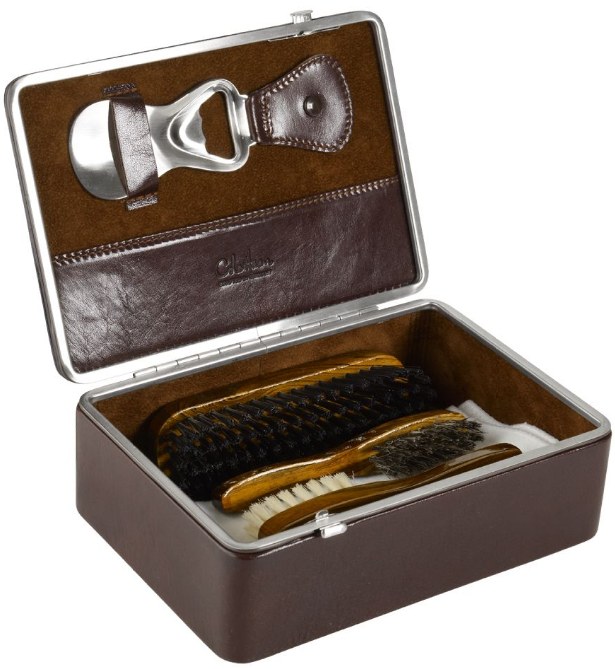 Trouble is, since it’s all stainless steel, high-quality brushes, and leather box up in here, this particular shinebox costs $228 over at Cole Haan. Maybe you could just use it as a reference point and get something a little more modest.