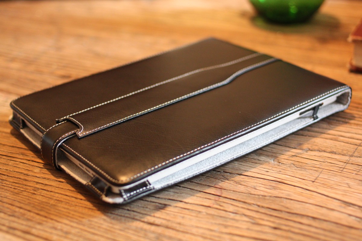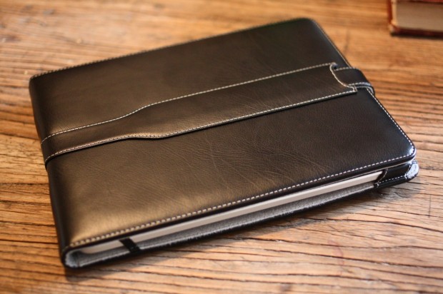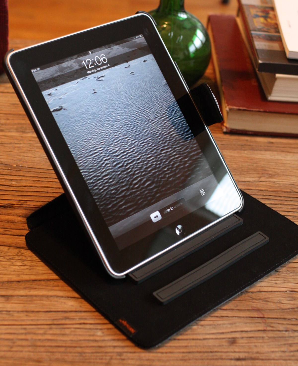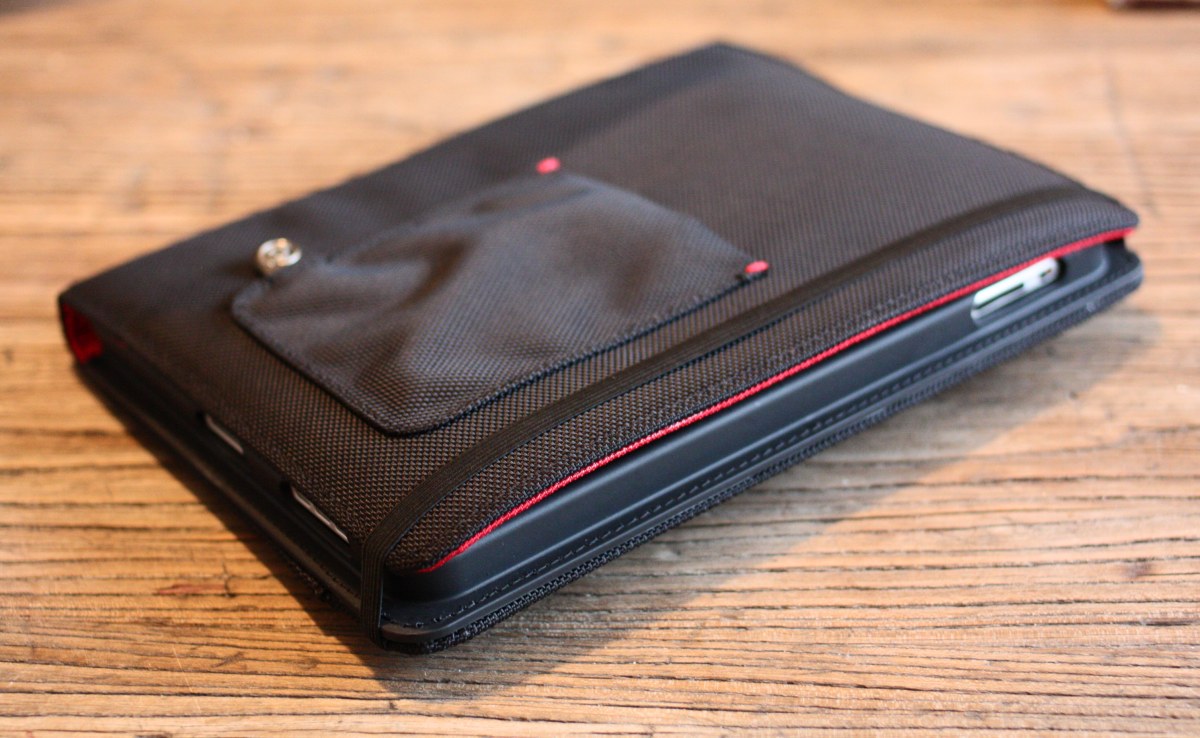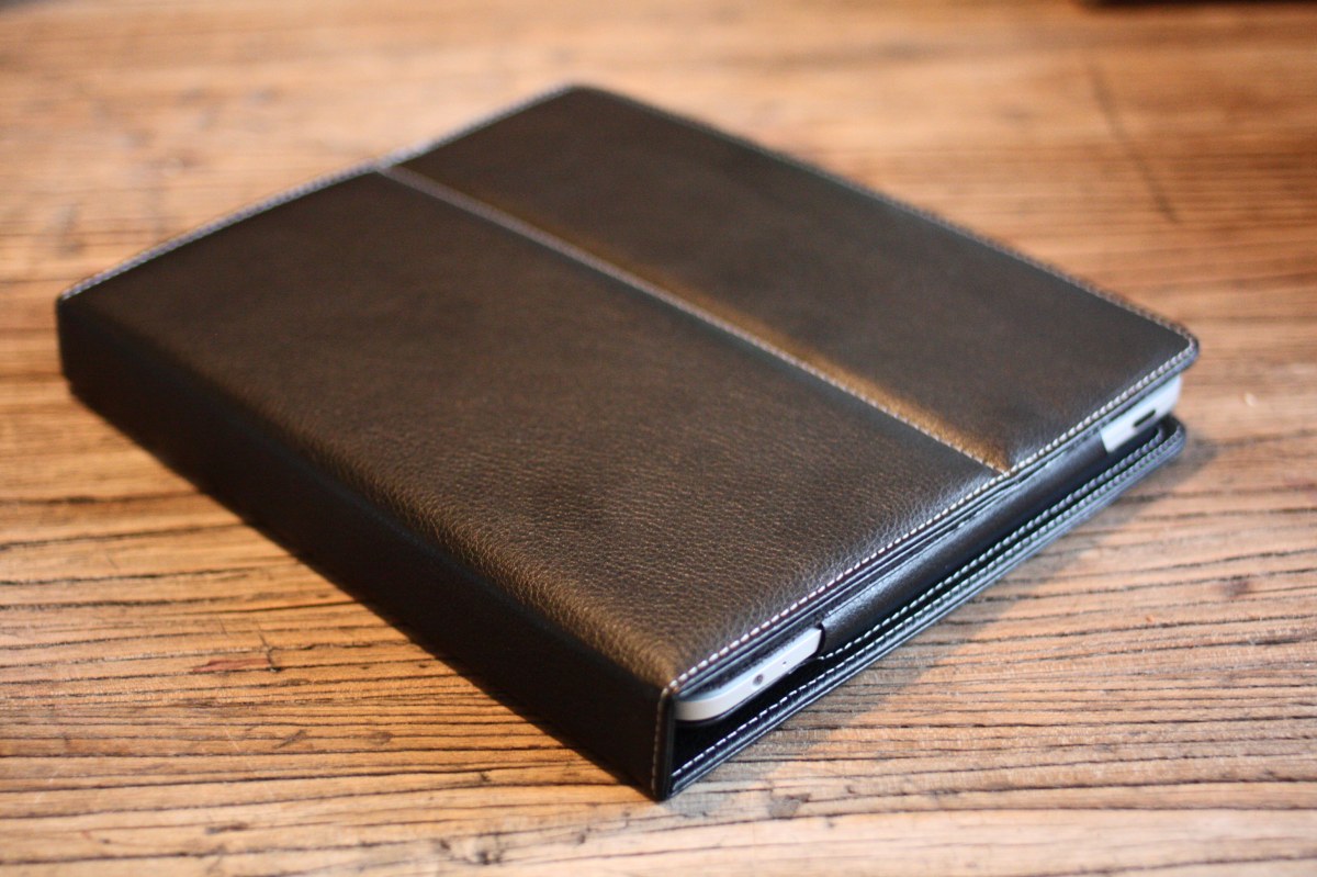 A more professional-looking entry from M-Edge. This one has a long tail that sticks into a sheath, holding the case closed (or open) very securely. The materials and detailing are very nice, there’s room on the inside for a few documents, and it stands up readily. It’s a little front-heavy when sitting in landscape mode, so be careful. I prefer this over the far more expensive Sena Folio, but I’m still not loving the attachment method.