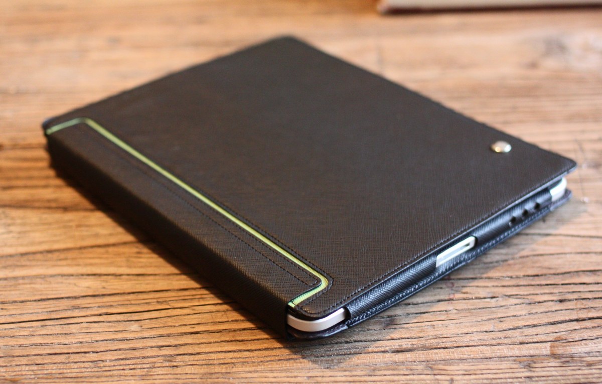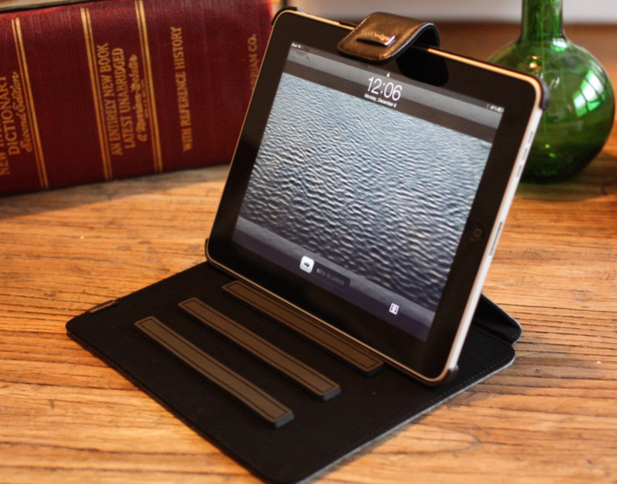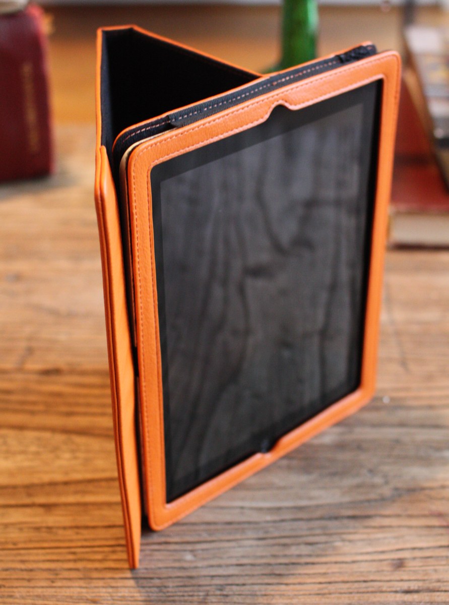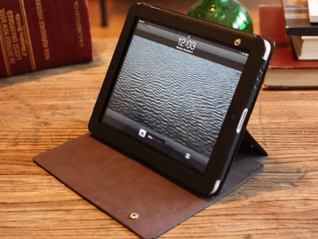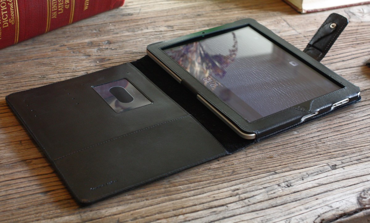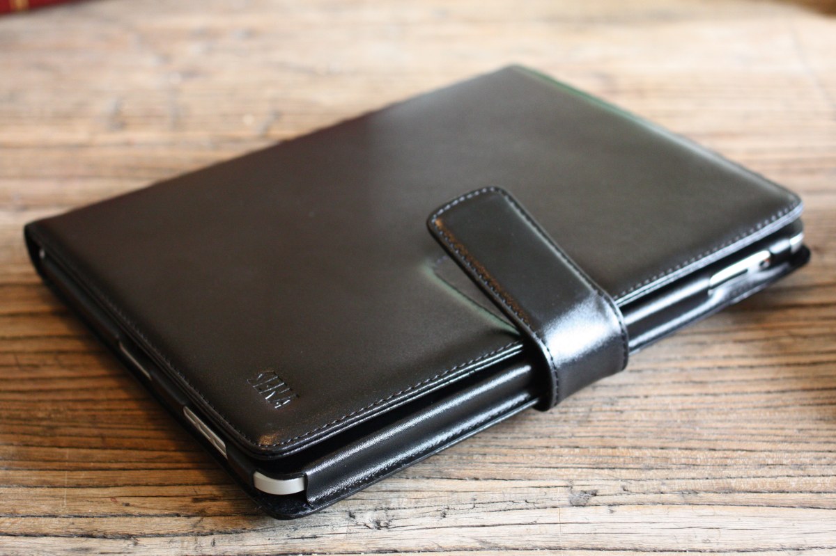 A more professional-looking entry from M-Edge. This one has a long tail that sticks into a sheath, holding the case closed (or open) very securely. The materials and detailing are very nice, there’s room on the inside for a few documents, and it stands up readily. It’s a little front-heavy when sitting in landscape mode, so be careful. I prefer this over the far more expensive Sena Folio, but I’m still not loving the attachment method.