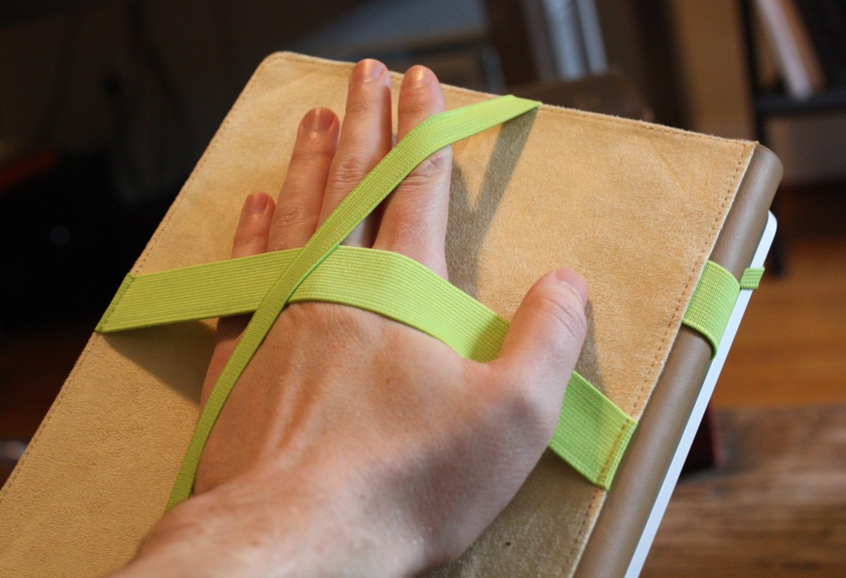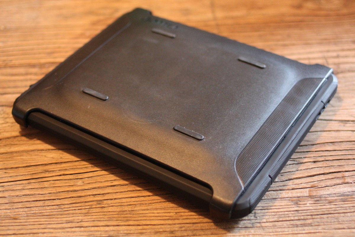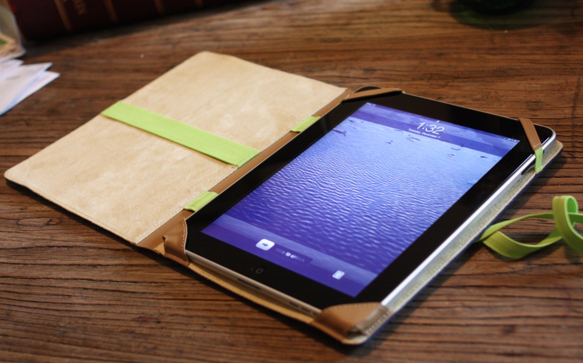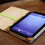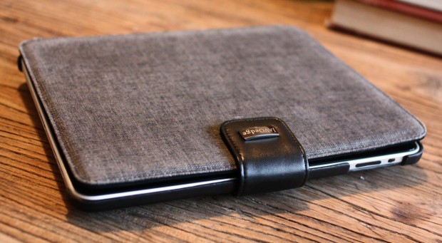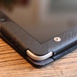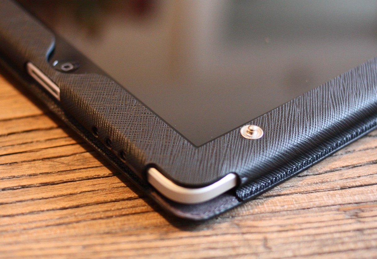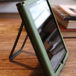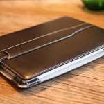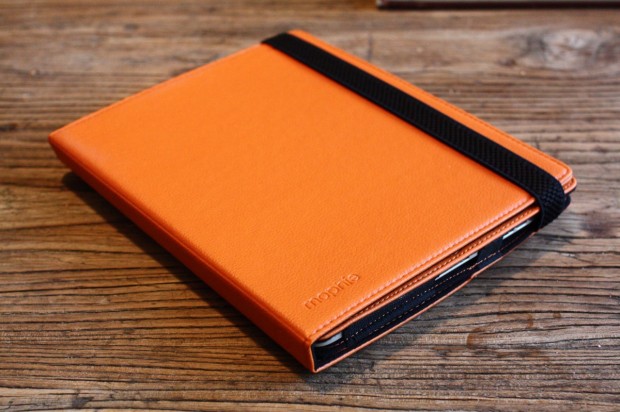 A more professional-looking entry from M-Edge. This one has a long tail that sticks into a sheath, holding the case closed (or open) very securely. The materials and detailing are very nice, there’s room on the inside for a few documents, and it stands up readily. It’s a little front-heavy when sitting in landscape mode, so be careful. I prefer this over the far more expensive Sena Folio, but I’m still not loving the attachment method.