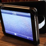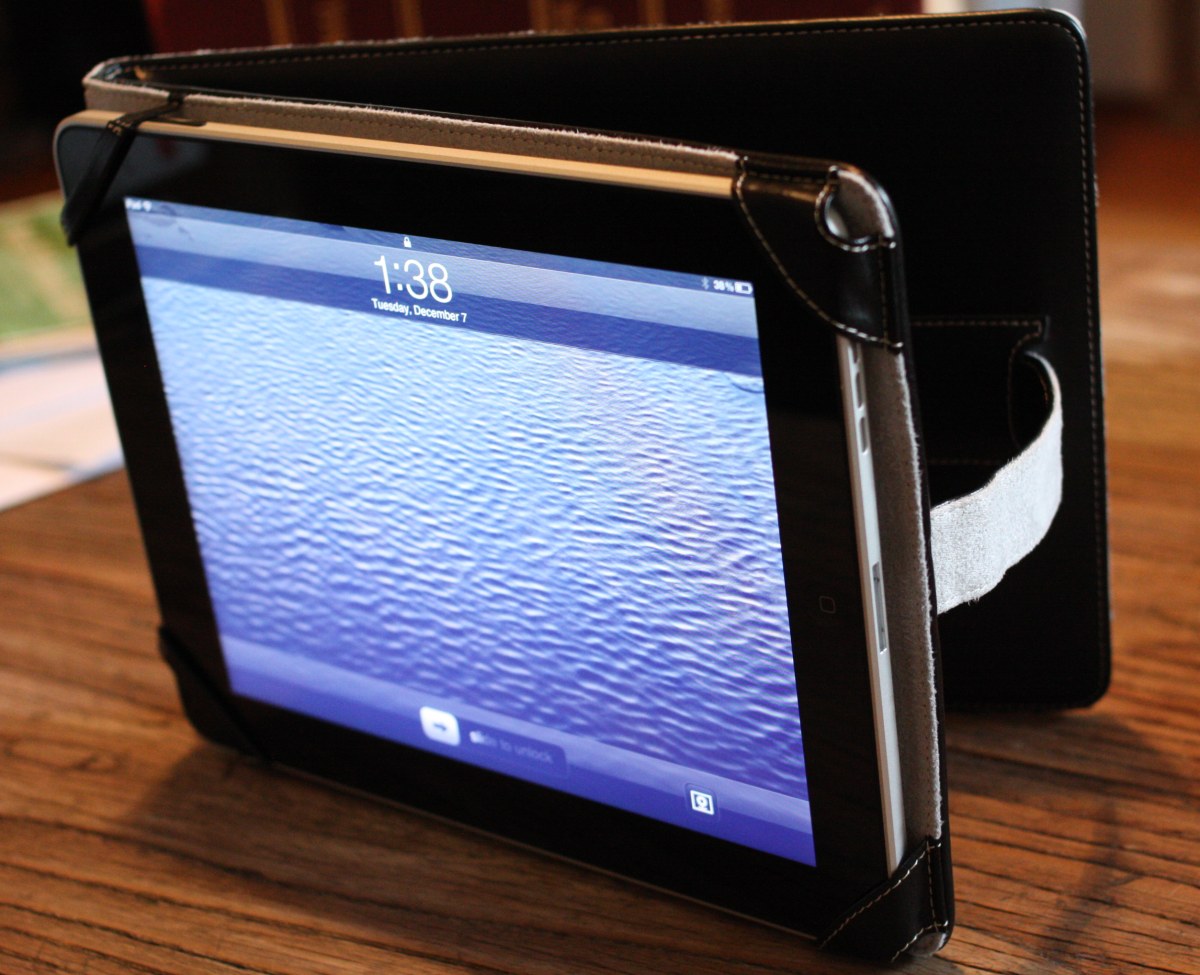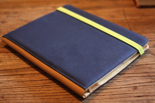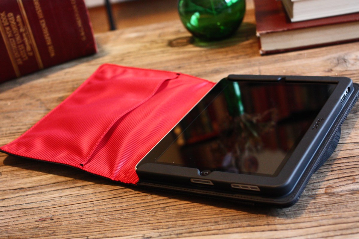 This is a lively, strappy little thing with a colorful look and treated canvas cover. It feels feminine to me for some reason, not that it’s a bad thing. The iPad is held on by little thongs, which I guess I would trust, but I’d fear they might stretch. There is an extra strap that lets you slip your hand under as a precaution against dropping it, or for use as a squash paddle. I’d have liked a few pockets in there though, and it’s not very good at standing up.