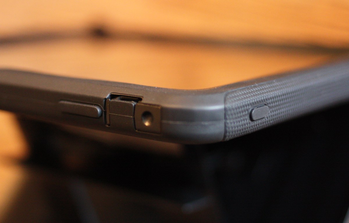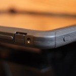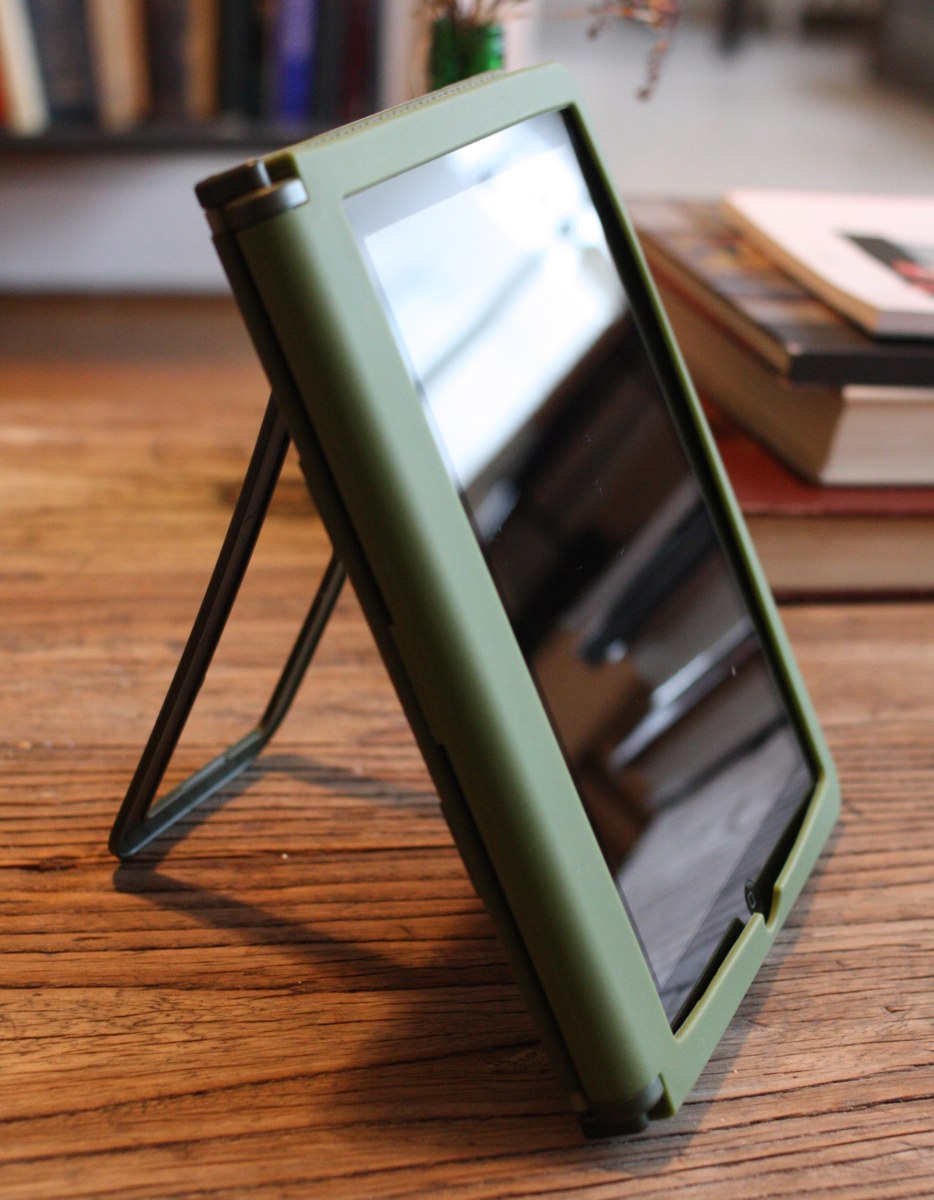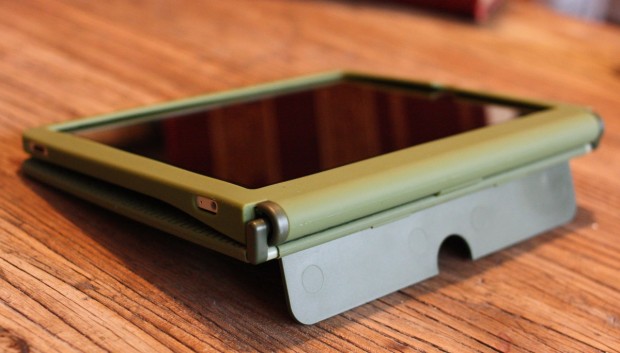 This is a silicone case with plastic fold-out bits that let you stand it up in portrait or reclining mode. It’ll stand up in regular landscape mode on its own. It’s got a nice grippy finish, but the folding parts feel cheap to me, like they’re going to snap off. It also rattles — not a lot, but I’m not sure I want a case that rattles.
