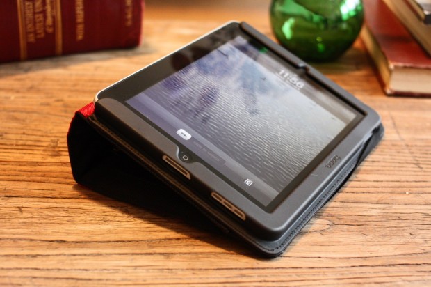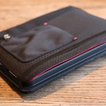 If you’re familiar with Booq’s bags, the Folio won’t come as too much of a surprise. It’s all covered in the same kind of nylon weave you find on messenger bags, and has a little (rather useless) pocket on the front. Open it up, and the cover folds back to prop up the iPad in a typing position. A nice traveling case, as it provides a good amount of protection, but it would have been nice if it stood up better. Ah well, you can’t have everything. The grey one at the Booq site looks nice, I wish I could have seen that one too.
