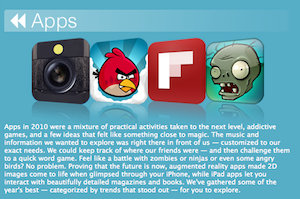 We’ve already highlighted the four apps that Apple has chosen as their “award winners” for 2010. But they’ve also highlighted the following: Overall Paid iPhone Apps, Overall Free iPhone Apps, Overall Grossing iPhone Apps, Overall Paid iPad Apps, Overall Free iPad Apps, Overall Grossing iPad Apps.