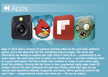 - Apple has also created “key trends” lists in the year-end App Store look for the first time. They are: Shoot, Edit, Share (camera apps), Augmented Reality, Fun for Foodies, New News, Generative Art & Sound (music/visual apps), Tech for Tots, The Cloud, Quick Fix Games, Hardcore Games, Retro Revival Games, Multiplayer Games, On The Grid (location-based apps), Personal Trainer, Band In Your Hand, Interactive Stories, Mobile Office, Magazines & Newspapers, Pen & Brush, and Zombies. Yes, Zombies have their own category.