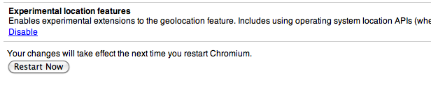 More specifically, Chromium, the open source browser on which Chrome is based, just recently received a new experimental feature hidden behind a flag (meaning you have to explicitly enable it). In the latest builds of Chromium version 10, you’ll see an option called “Experimental location features”. Apparently, when switched on, this allows the browser to run “experimental extensions to the geolocation feature.”