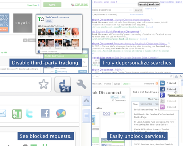 You remember Facebook Disconnect, the browser extension that allowed you to remove Facebook Connect functionality from websites? After 50K active users in two weeks and hitting the top 10 Google Chrome extensions, creator Brian Kennish has left his job at Google to focus on building Disconnect, a browser extension for Chrome and Rockmelt that disables multiple third party data tracking while browsing. In the same vein as Facebook Disconnect, Disconnect prevents major third parties like Digg, Facebook, Google, Twitter and Yahoo from gathering information (cookies) about the pages you go to and the searches you do.