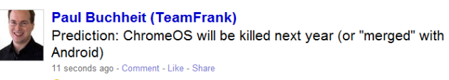 Considering his former employer just launched the Chrome OS pilot program last week, the comment may sting a little over at Mountain View, although it should be noted Buchheit is hardly the only one predicting that Google’s Linux-based operating system will go the way of the Wave soon enough.