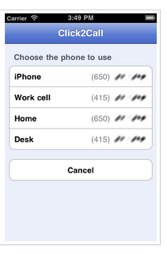 When you click a “Call button” in the new app on an iPod or iPad, you can select which of your registered phones you want to use to connect the call. Google Voice will call your phone and then connect your call to the contact’s phone number.