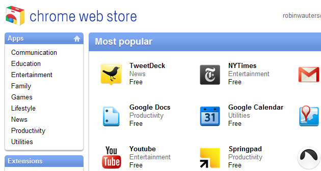 The list of top 10 most popular apps on the Chrome Web Store includes Google Calendar, Google Books, Google Docs, Google Reader, Gmail, Google Maps and YouTube.