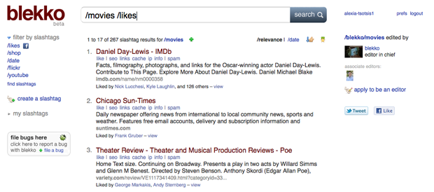 The feature also allows for some nifty tricks: You can search for everything movie related in your social graph by searching for /Movies /Likes. You can also click on a users’s name to see their ‘Likes’ and actually ‘Like’ individual results which will add the ‘Likes’ to your /Likes slashtag (Warning, this feature was a little buggy at the time of our demo). “We think this gives users a reason to use the ‘Like’ button, as a way of bookmarking something so you can search for it again in the future,” says CEO Rich Skrenta.