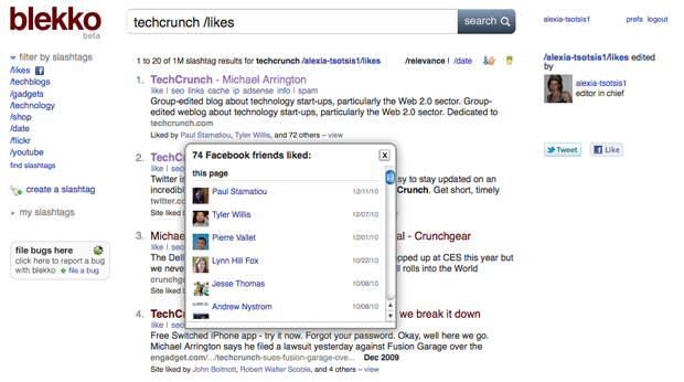 Unlike Bing’s Facebook ‘Like’ integration, Blekko’s new feature doesn’t just surface ‘Likes’ next to already existant result URLs. You can actually change the results you see based on what your friends have ‘Liked’ by searching and adding the /Likes slashtag to any search, for example TechCrunch /Likes.