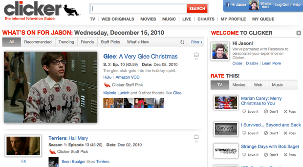 It’s a logical integration, and it should help users sift through the vast amount of video content that’s been indexed by the site. After logging in, Clicker told me that I’d probably be interested in the latest episode of Glee, based on ‘Likes’ from 9 of my friends. Good job, Clicker — I happen to be a Glee fan, though the plot lines sometimes me make want to throw my remote across the room (breathe, Jason, breathe). The site is also recommending Terriers based on one ‘Like’ from a friend of mine, which sounds interesting. I’m not sure what to make of the suggestion to rate the ‘Mariah Carey: Merry Christmas to You’ special.