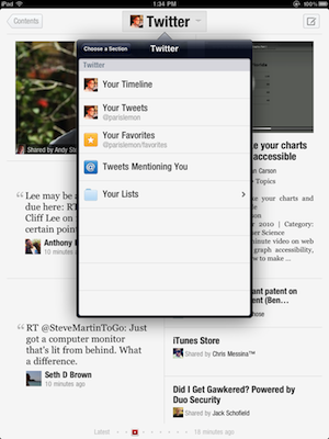 But the bigger news is what they’ve added to the content options that have existed on Flipboard since the beginning: Twitter and Facebook. Both of these areas on Flipboard now feature support for various sections of the services. So on Facebook, you can browse items shared in the News Feed, on your Wall, on the various Pages you follow, or filter items by the Friend Lists you have. You can also filter the stream to show just pictures or just links. With Twitter, you can now choose between your standard Timeline, just your Tweets, your Favorites, your @Replies, or any of your Lists.