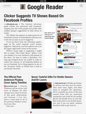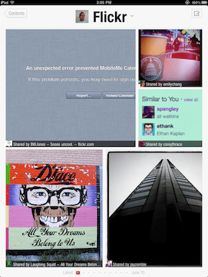 First of all, Flipboard has added both Flickr and Google Reader integration to bring more content into the system. Users of those services can easily link up their accounts to create new areas to browse on their Flipboard.