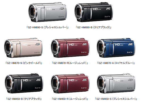 JVC announced [JP] three new Everio camcorders yesterday, the high-end GZ-HM670/690 and the GZ-HM450. While the first two models boast a back-side illuminated 3.3MP CMOS sensor (for better images in dark areas), the HM450 only has a 1.5MP CMOS sensor.