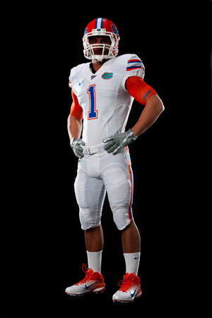 Moving on to the Pro Combat uniform (above). They’ll debut over three of the 8 zillion college bowl games coming up in the next month or so. The Boise State Broncos will wear ’em on December 22; the Florida Gators will wear ’em on January 1; and the Oregon Duck will wear ’em on January 10.