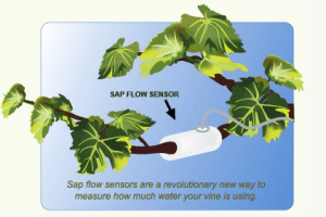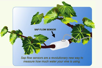 “[The company’s] real-time sensors [are placed on vines, and] send a wireless reading of a vine’s transpiration rate, providing a precise measurement of how much water is moving through the vine…This gives an indication of the vine’s water needs. A slow rate of transpiration indicates a vine is low on water (stressed) and potentially at risk of berry dehydration.”