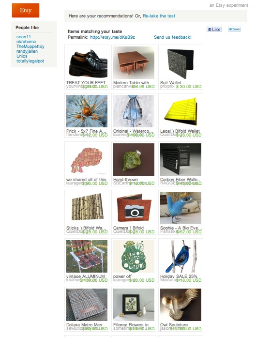 Gift giving can be so hard, especially if you have a bunch of hipster friends who turn their noses at anything even slightly pedestrian. (“A box of See’s Candy that you bought at the airport? Are you kidding me?”). Well, fear not. All you need to do is make them take this little Etsy Taste Test on the commerce site for hand-crafted goods. After selecting a series of product photos that match their taste, they wil be presented with a grid of recommended products, along with other people on Etsy who have similar tastes.