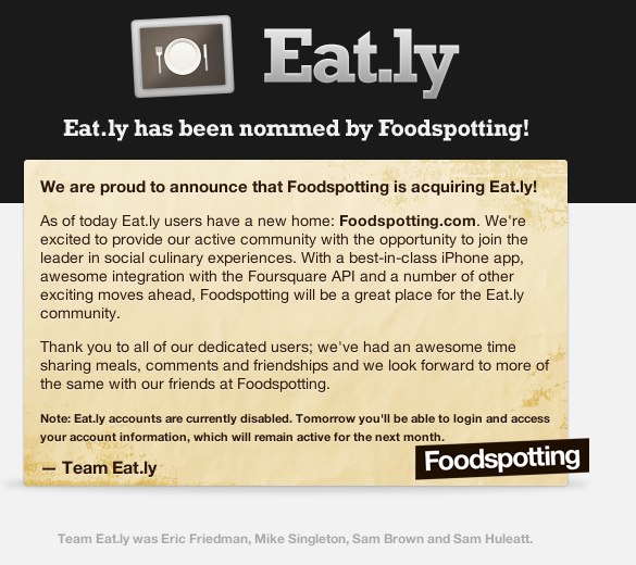 Foodspotting, the service that allows you to take pictures of your food to share with others, is acquiring a competitor in the space: Eat.ly. Financial terms of the deal were not disclosed.
