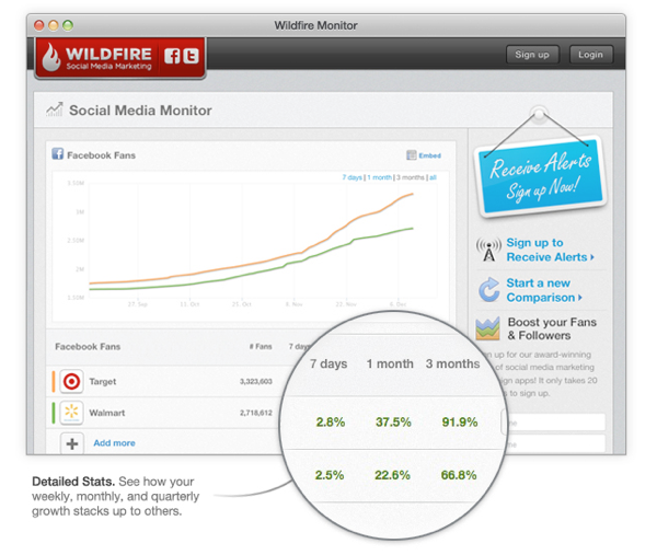 For many years, the tech industry has gauged the success of websites by tracking usage stats like the number of unique visitors and page views the site receives each month. Wildfire, a service that helps companies run contests and social media campaigns via Twitter, Facebook, and email, is launching a new tool that looks to do the same for social media presences — in other words, it lets you visualize who has the most Twitter and Facebook followers, and how quickly they’ve grown over time. You can access the new monitor at http://monitor.wildfireapp.com.