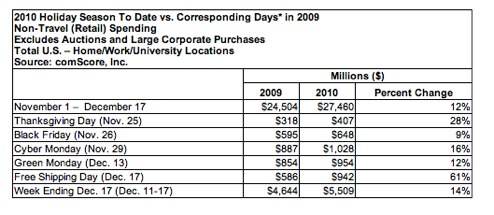 Each of the past five weeks has seen free shipping on at least half of transactions, while that benchmark was reached only once during the 2009 season. For the five-day week ending with Free Shipping Day, the percentage of transactions with free shipping reached 52.7 percent, up 12 percent from last year.