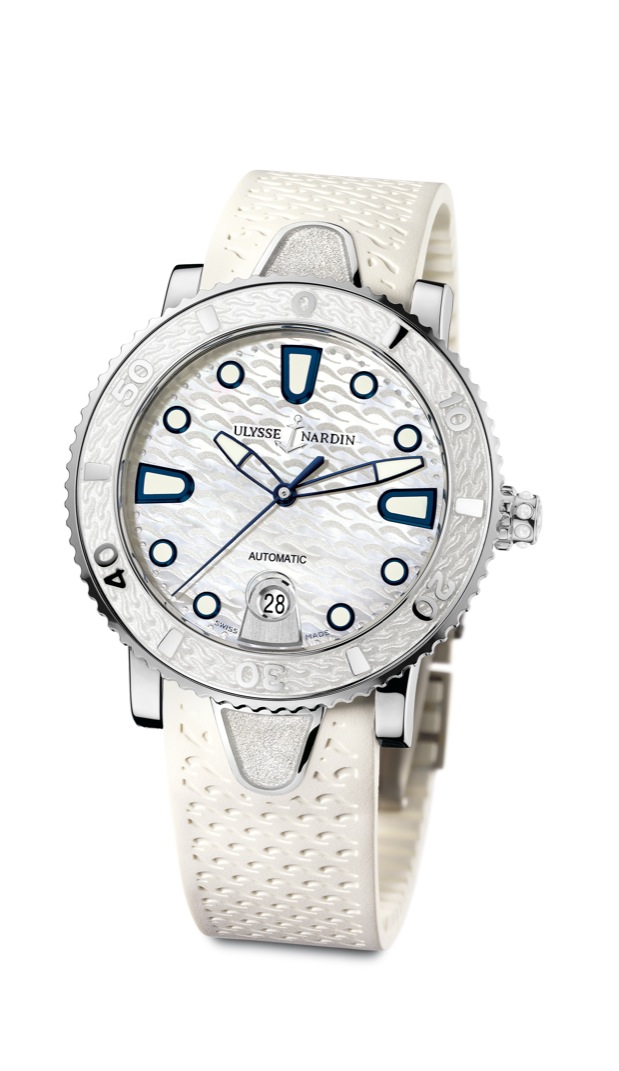 For the woman who likes a timepiece that is as durable as it is attractive, the Lady Diver fits the bill. Dressed in a white, blue or black on a rubber strap and resistant to 100 meters, it can weather a trip under the mistletoe by land or sea. Price: $5900