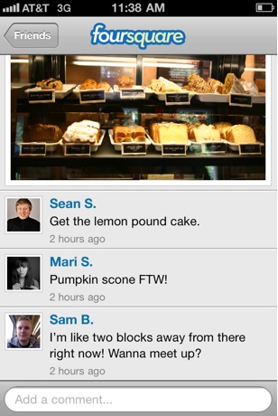 Comments are a bit different. Those can be left on a check-in in your stream and are only visible to your friends and to their friends (so it doesn’t look like they’re talking to no one). Foursquare envisions that this feature will allow the service to become even more social both online and offline as there will obviously be some fun discussions on odd check-ins, and you’ll also now be able to see friends who are nearby and comment on their check-ins to set up a meetup.