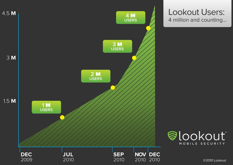 Lookout’s web-based, cloud-connected applications for Android, Windows Mobile and BlackBerry phones help users from losing their phones and identifies and block threats on a consumer’s phone. Users simply download the software to a device, and it will act as a tracking application and a virus protector much like security software downloaded to a computer. The company also announced today that it now has four million users, after crossing the two million mark in September.