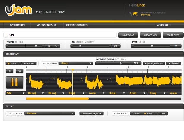 All you do is hum, whistle, or sing, and Ujam can turn your voice into nearly any instrument and fix it so that it is in tune. You can also upload your own pre-recorded tracks or pick pre-existing tracks on Ujam from different styles of music (Kraftwerk, 80s Rock, Campfire Guitar). The Ujam music editor lets you change the instruments, tempo, pitch, and mix between vocals and music to create your own composition. Once you are done, you can save your songs and download them as MP3s for sharing.