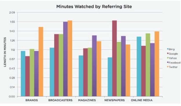 When it comes to actual engagement in terms of minutes watched, however, viewers coming from Twitter watch longer on average than people coming from either Facebook or search. Twitter’s higher engagement is something Tubemogul has been tracking for a while. But when you break down engagement by different type of media sites, you get more of a mixed bag. Twitter shares result in longer video views for broadcasters, brands, and online media (the orange bars in the chart below), but people coming from Facebook watch longer on magazine and newspaper sites (the purple bars). And Google (maroon bars) still beats both for time spent watching videos on newspaper sites. If you think about it, that makes sense since people go to Google looking for timely information, so they are more likely to watch a news video for a longer period of time coming off a search than, say, an entertainment video. In all of these cases we are talking about average time spent watching of less than 2 minutes, so it is all relative.