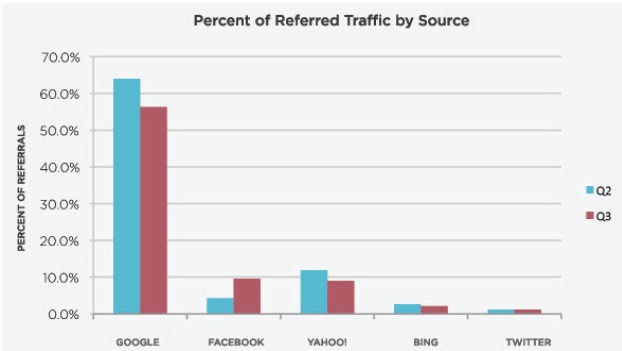 In the third quarter, Facebook shares accounted for 9.6 percent of online video traffic. Google still towers above Facebook with more than 50 percent of the referring traffic coming from search, but that is down from the second quarter when it was above 60 percent. In fact, across all search (Google, Yahoo, and Bing), referral traffic to videos on media sites is down.